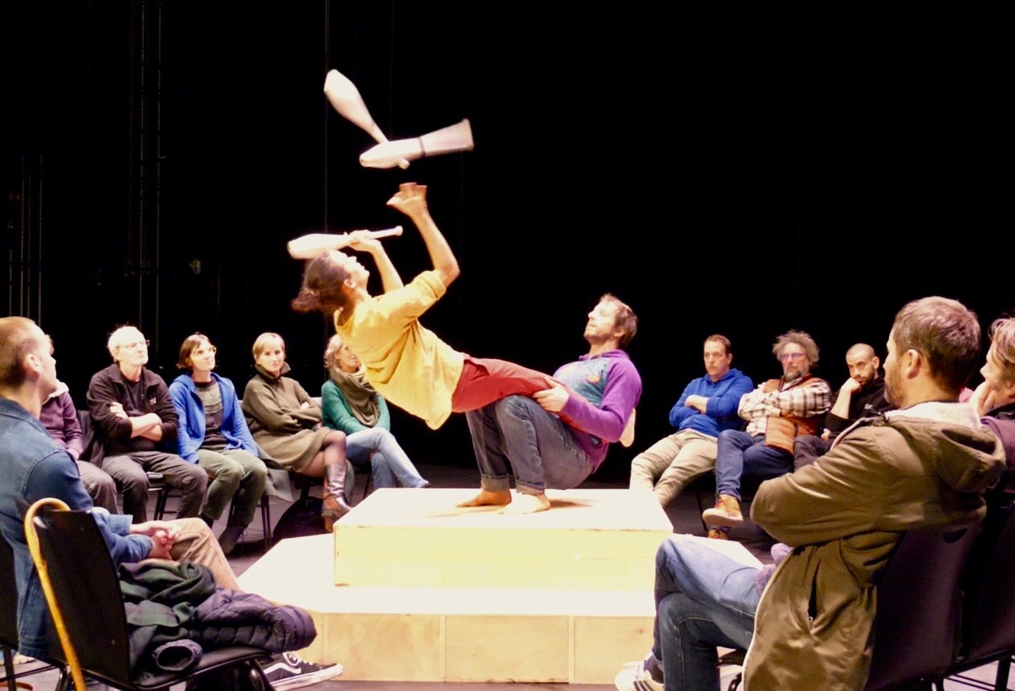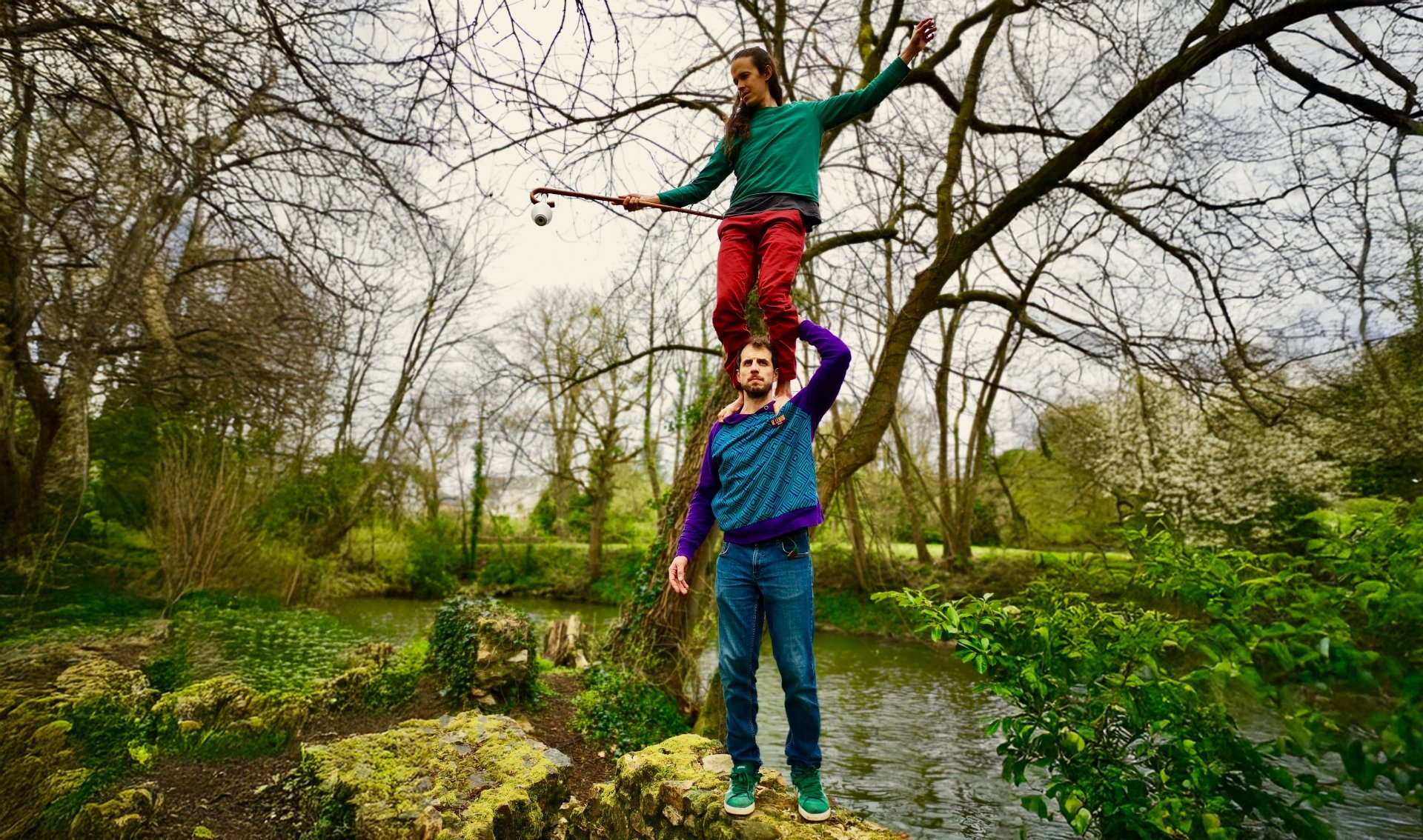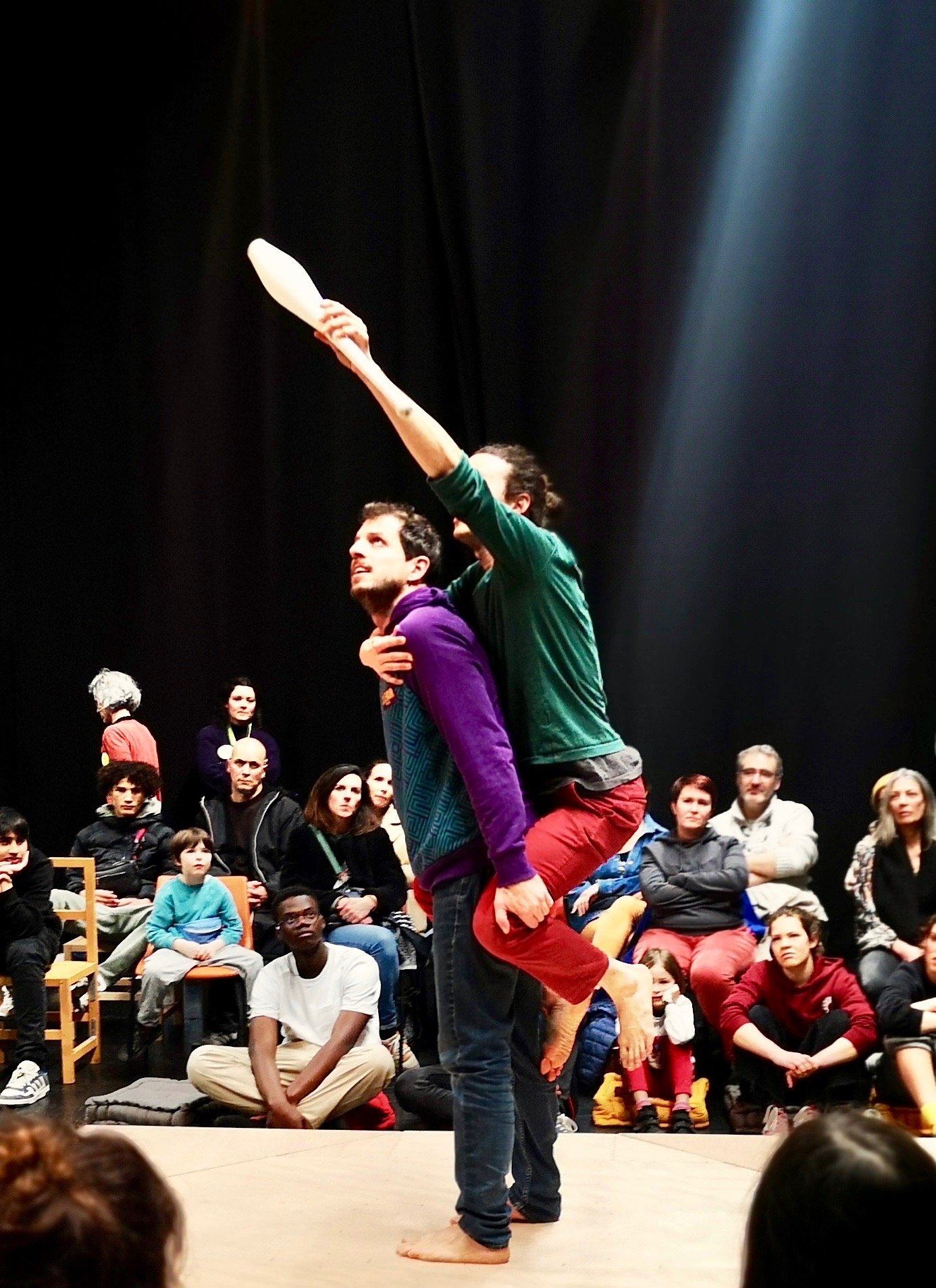 Tandis que l’un porte l’autre qui jongle, deux artistes de cirque dialoguent sur la paternité, leurs doutes et leurs amours. La Compagnie Allégorie met en partage un cirque généalogique généreux qui s’adresse aux enfants que nous sommes ou avons été.