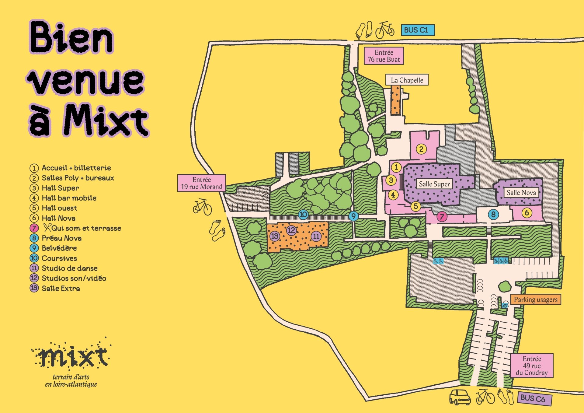 Une fois à Mixt, 7 places de parking réservées, cheminements plats, bande de guidage.